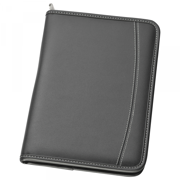 - The interior layout includes a gusseted pocket, pen loop, business card holders and a 25 page lined pad