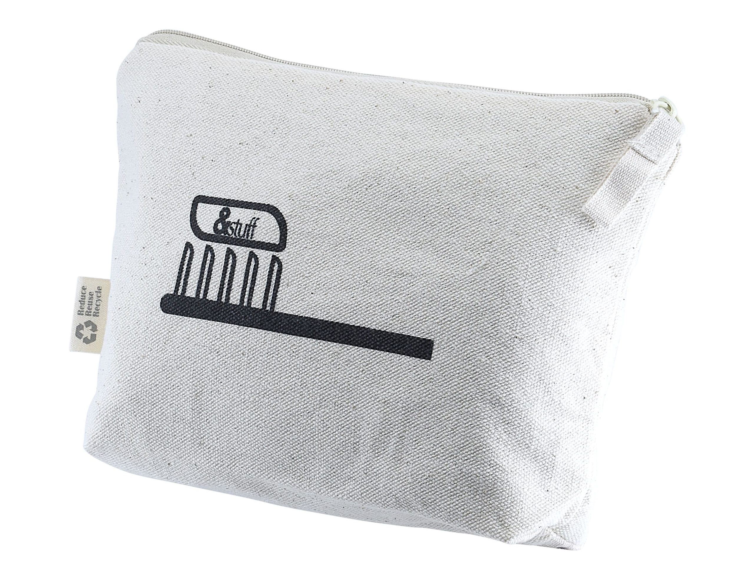 - Your logo can be printed or debossed on one side of the pouch with our &Stuff icon printed on the reverse side