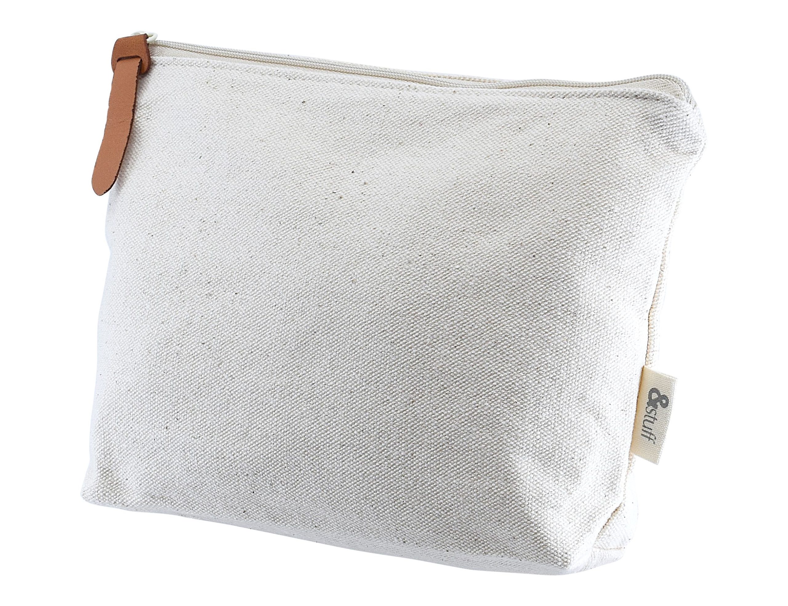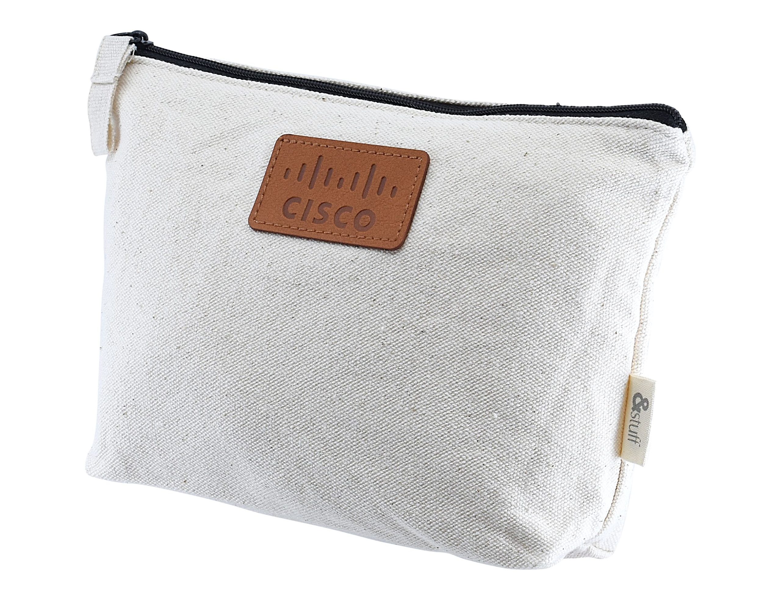 - Options – select either: (1) natural or black coloured zip, (2) natural cotton zip puller or leatherette zip puller, (3) debossed logo onto the leatherette badge or screen printed directly onto the calico material