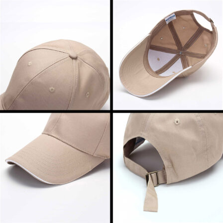 • Structured six panel 100% heavy twill Cotton cap with a white trim in the pre-curved peak embroidered eyelets and an adjustable closure with metal buckle which fits most of people