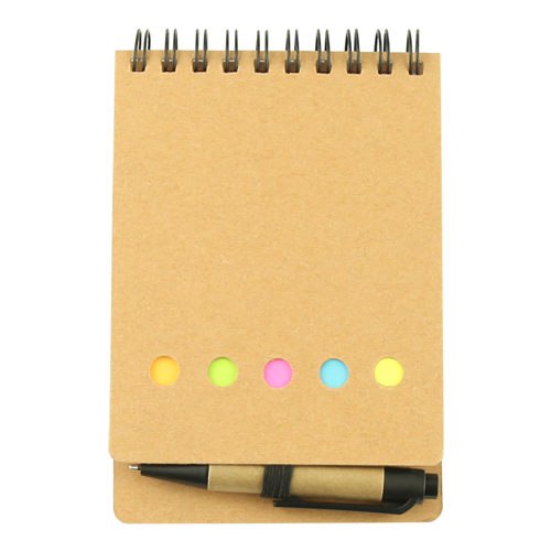 - A spiral bound multi-purpose note pad has a 60 leaves(120 pages) lined note pad, a 25 leaves yellow adhesive note pad, five different coloured paper pads of adhesive flags (orange, grreen, pink, blue, yellow), and a recycled cardboard barrel pen slips into the elastic retaining closure