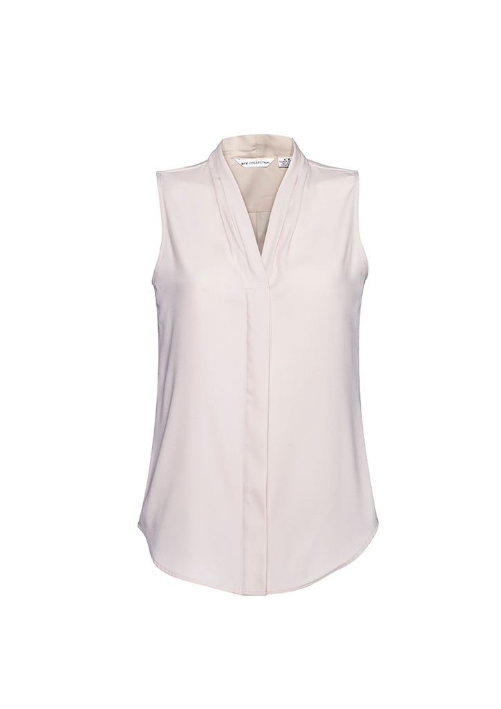 - Our Madison sleeveless blouse has a clean, shawl collar neckline and concealed buttons, creating a beautiful understated silhouette