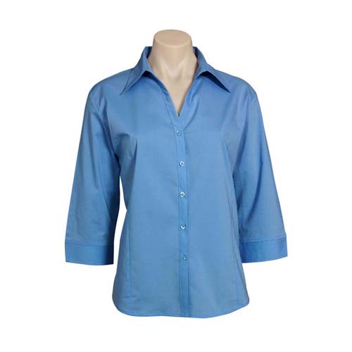 - Ladies style features open neckline with slimline placket, cuffed sleeve and curved hemline