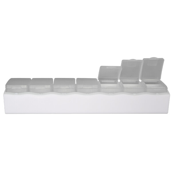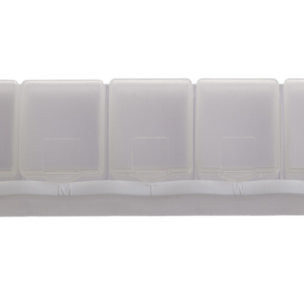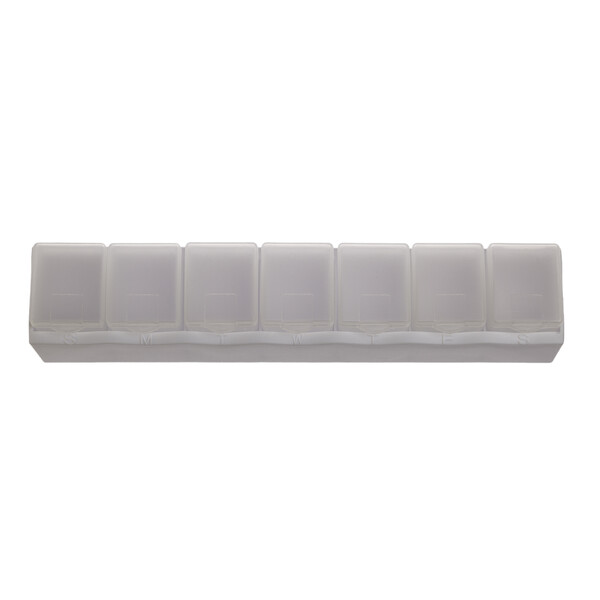 - Featuring seven removable compartments, each marked with the first letter of the day for easy identification, this sleek pill box has a white base and frosted containers, offering both convenience and discretion